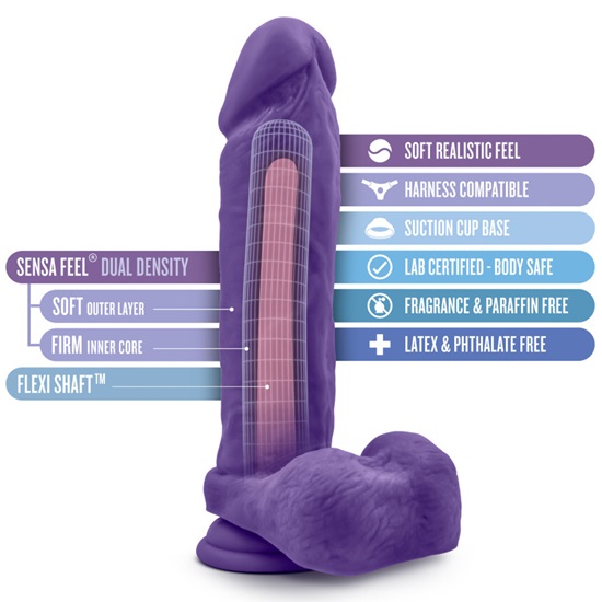 The Au Naturel Bold Massive 9 Inch Dildo with balls by Blush Novelties is a vaginal and anal stimulating sex toy for women and men, this realistic dildo has a stiff inner shaft and soft outer skin. The realistic textured details are plushy Sensa Feel Dual Density lifelike skin material making the feel and flexibility of a real cock.