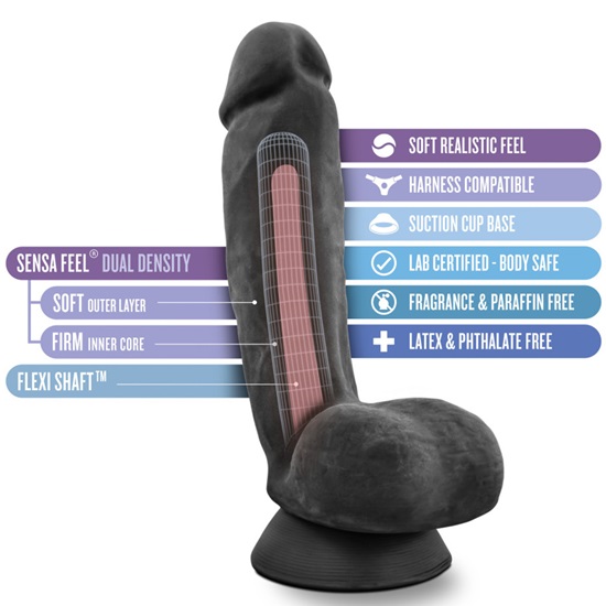 The Au Naturel Bold Pound 8.5 Inch Dildo with balls by Blush Novelties is a vaginal and anal stimulating sex toy for women and men, this realistic dildo has a stiff inner shaft and soft outer skin. The realistic textured details are plushy Sensa Feel Dual Density lifelike skin material making the feel and flexibility of a real cock.