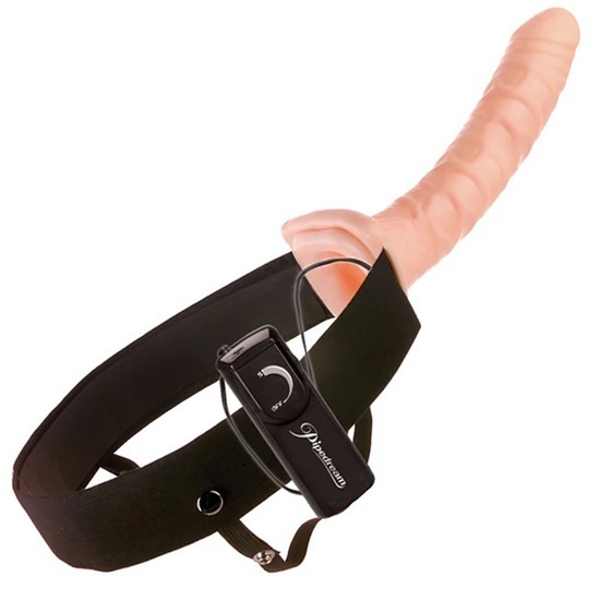 The Fetish Fantasy 10 Inch Vibrating Hollow Strap-On by Pipedream is a unisex vaginal and anal stimulating sex toy for women and men, perfect for men with ED, premature ejaculation problems, or couples looking to add a little flair to their fun.