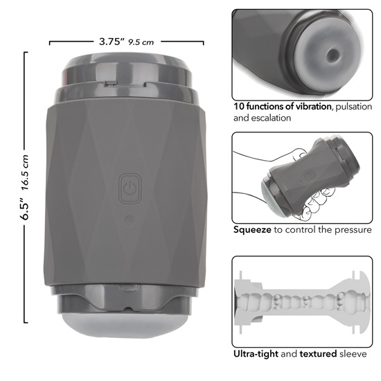 The Vibro Squeeze Stroker offers 10 thrilling functions of vibration, pulsation, and escalation. It brings variety to every session. The ultra-tight, textured sleeve heightens each stroke. Its open-ended design makes cleaning quick and easy. The EZ grip casing gives you a strong, confident hold. Removable caps keep it safe and discreet when not in use.